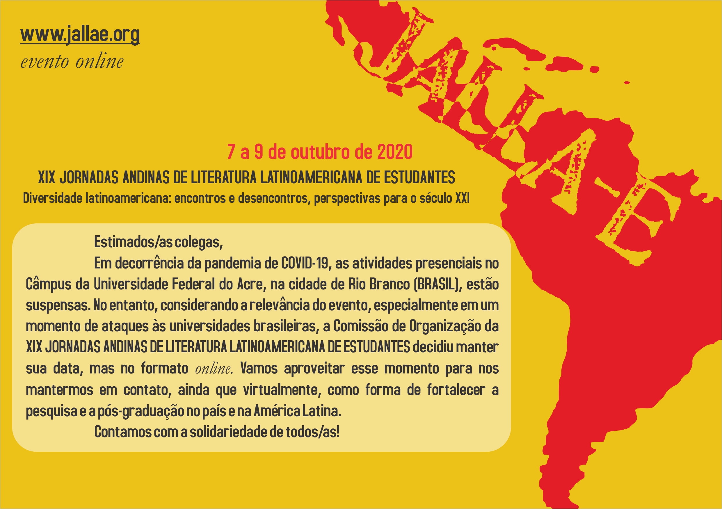Notícias XIX Jornadas Andinas de Literatura Latinoamericana de Estudantes publicado: 11/02/2020 09h51, última modificação: 08/10/2020 11h44 Convocatória - XIX Jornadas Andinas de Literatura Latinoamericana de Estudantes